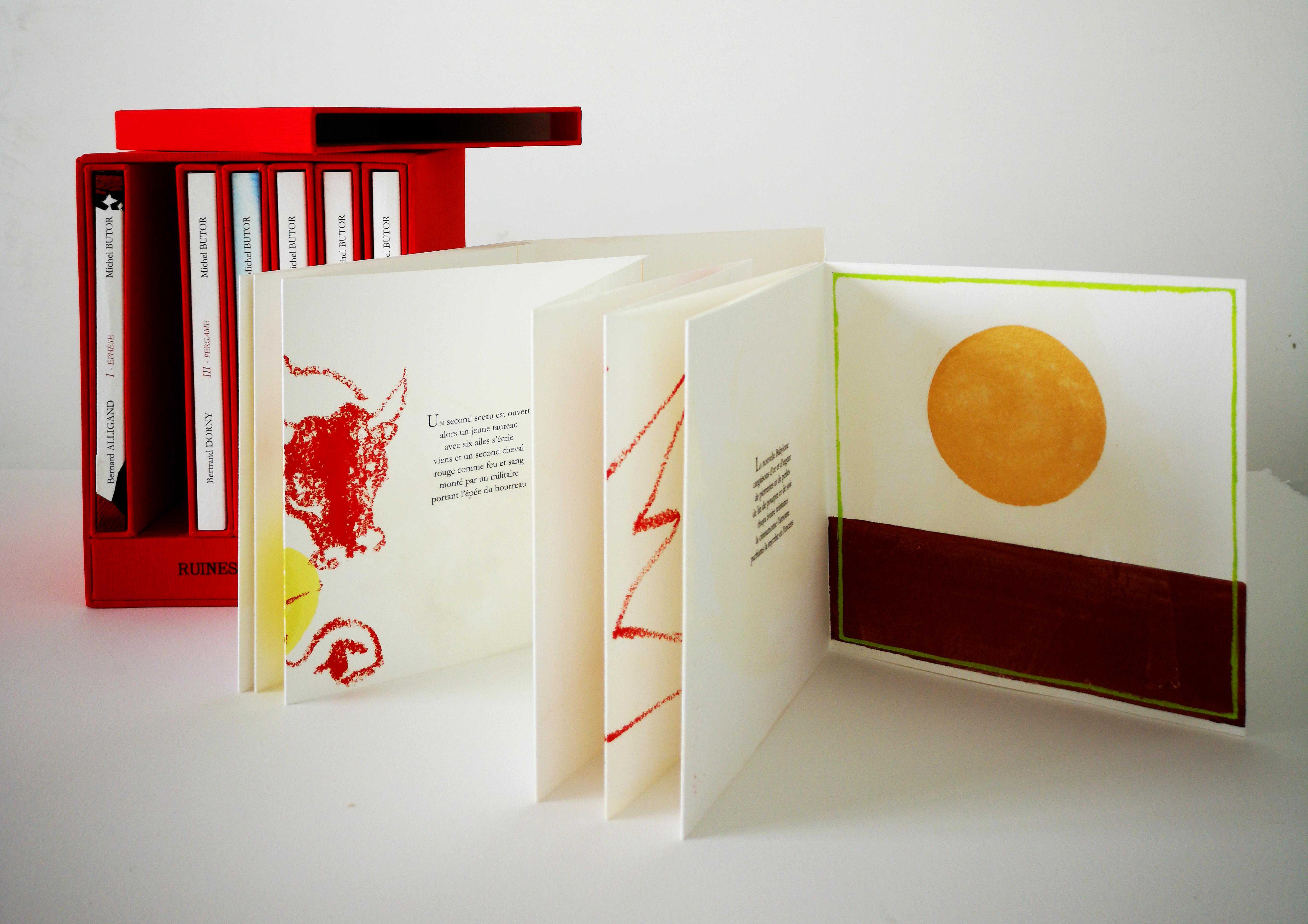 要进一步去理解派蒂西亚·埃蓓尔丁,我们不妨看看雕塑、摄影、手工书这些她绘画外的平行创作。她的雕塑以铁雕为主,铁在她作品中不断出现,但与她绘画中蛀蚀的用法(减法)相反,在此以铸造的方式(加法)出现。摄影是她旅行的私密记录,手工书则是她和其他艺术家、诗人或作家相遇,互相激荡出来的果实。手工书强化文字与绘画间的自然连结,是一种对话的形式,就像音乐中的重奏,不同的乐器、声部结合成同一首乐曲,“手工书的形式与内容必须是和谐的,也因此每一本手工书都是一个全新的概念,诗文与绘画的位置一样重要。”派蒂西亚如是说。三十多年来,她制作了五十多本手工书,合作的对象不只是她的好友、知名的法国画家东尼·苏利叶(TonySoulié)、黎卡多·摩斯讷(RicardoMosner)等,也包括法国新小说大师米歇尔·布托尔(MichelButor)。二O一六年布托尔过世前的最后文本《未来的废墟》(RuinesD’avenir),派蒂西亚就是合作的七位视觉艺术家之一。