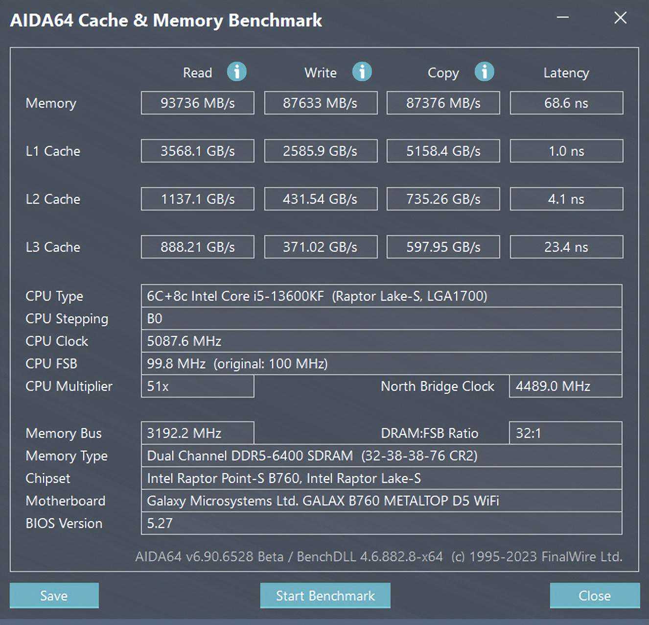 内存读写测试,直接开启XMP,内存读取速度为93736MB/s,写入速度为87633MB/s,复制速度为87376MB/s,延时为68.6ns;