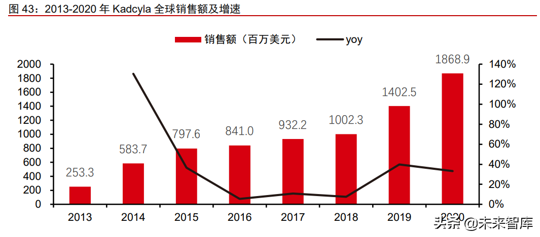 得益于优异的临床疗效,Kadcyla成为目前全球商业化最成功的ADC药物。2020年全球销售额达18.69亿美元,同比增长33%,在2020年度全球最畅销肿瘤药物中位列第十一。