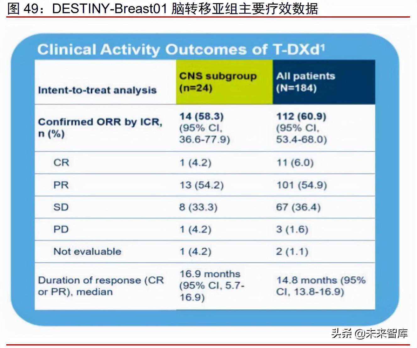Enhertu对HER2+乳腺癌伴脑转移患者同样有效。对于HER2+乳腺癌伴脑转移的患者,目前的治疗措施仍然十分有限。2021年ASCO大会公布研究者对DESTINY-Breast01队列中伴有脑转移的患者的亚组分析,结果显示经ICR确认的ORR高达58.3%,中位缓解持续时间为16.9个月,体现了Enhertu在HER+乳腺癌伴脑转移患者中优异的疗效。目前,公司已开展4项临床研究,用于Enhertu在HER2+乳腺癌伴/不伴脑转移患者中的疗效评估:DESTINY-Breast07(NCT04538742),DESTINY-Breast12(NCT04739761),TUXEDO-1(NCT04752059),DEBBRAH(NCT04420598)。