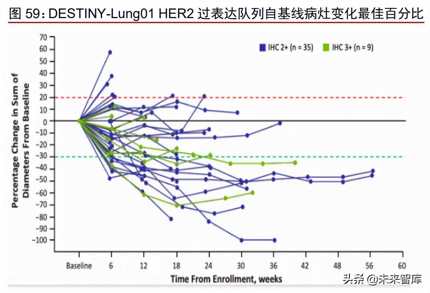 Enhertu治疗HER2过表达NSCLC患者ORR为24.5%。DESTINY-Lung01是一项开放标签、多中心的II期临床试验,旨在评估Enhertu用于治疗HER2过表达或突变的不可切除可/或转移性非小细胞肺癌(NSCLC)患者的疗效。WCLC2020和ESMO2021分别更新了HER2过表达队列和HER2突变队列的研究结果。WCLC2020公布数据显示,截止至2020年5月,HER2过表达NSCLC患者队列共49位患者接受Enhertu治疗,ICR确认的ORR为24.5%(95%CI:13.3%-38.9%),DCR为69.4%,中位PFS为5.4个月。其中IHC2+和IHC3+患者ORR分别为25.5%和20.0%。