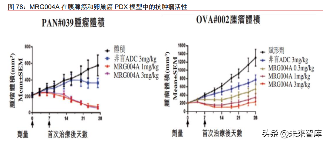 MRG003有望克服EGFR-TKI耐药突变的临床难题。MRG003由人源性EGFR单克隆抗体、可剪切VC连接子和小分子毒素MMAE连接而成。EGFR-TKI(EGFR酪氨酸激酶抑制)已广泛应用于EGFR突变或异常表达的肿瘤患者,然而部分患者接受小分子EGFR-TKI药物治疗出现获得性耐药突变,成为亟待解决的一大临床难题。MRG003强大、广谱的抗肿瘤疗效在多种肿瘤小鼠模型(包括CDX模型和更具临床相关性的PDX模型)研究中得到证实。例如,在对第三代EGFR-TKI奥希替尼具有耐药性的NSCLCPDX模型LUN2210-4a中测试MRG003的抗肿瘤活性,MRG003呈现出剂量依赖性的抗肿瘤活性,3mg/kg剂量下在第28天彻底根除肿瘤。因此,MRG003最大的临床优势是有望克服EGFR-TKI引起的多种获得性耐药突变,满足这类患者的临床需求。