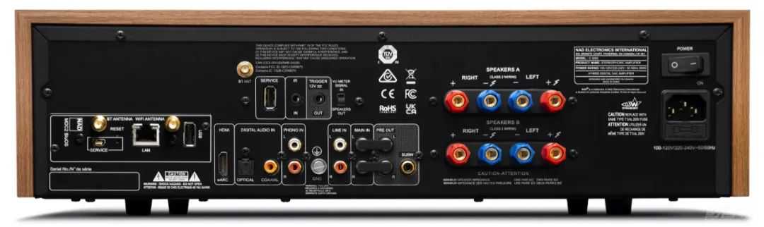比如,采用NAD著名的HybridDigitalUcD放大技术,输出功率可达100W×2(瞬时输出为135W)。数字部分是TI高分辨率差分DACPCM5242,其以出色的动态和时钟抖动抑制闻名。作为一款全功能型的Hi-Fi放大器,它支持光纤、同轴数字输入,甚至还包括了附带eARC功能的HDMI端口,模拟部分除了线路输入,还内置了MM的唱放电路,便于连接黑胶唱盘。前后级的短路桥,可以将它分别作为前级或后级使用,超低音输出也不可或缺,因为NAD是“Hi-Fi超低音”的倡导者。与限量版不同,MDC2BluOS-D是选配件,但它可以提供流媒体播放、DiracLive等各项丰富功能,我们强烈推荐。