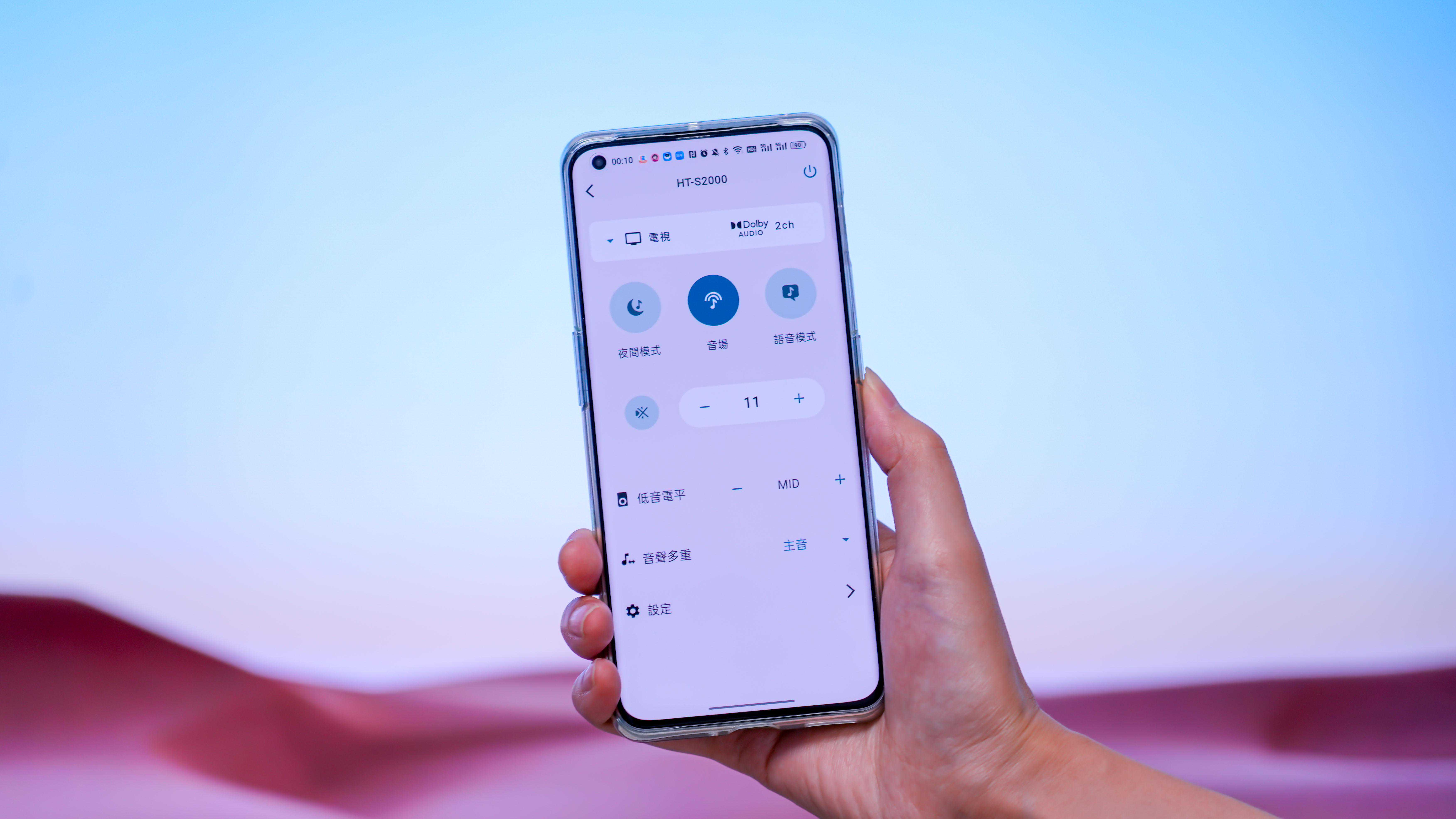 索尼HT-S2000是索尼第一款带有APP的回音壁,手机端直接下载HomeEntertainmentConnect即可,国区都有上,这个APP的操作十分简单,通过蓝牙就能连,不需要注册啥的,打开就能用,而且界面功能设计也极其简单,最上方就夜间模式,声场以及语音模式,下方调节音量,常用的就这些;另外系统更新、无线扬声器连接、A/V同步在内的所有功能也能在里面找到。