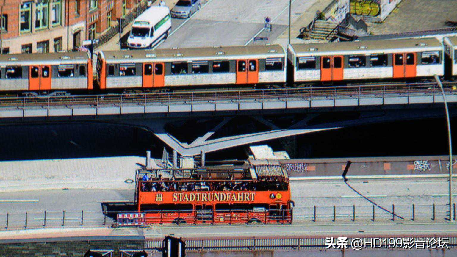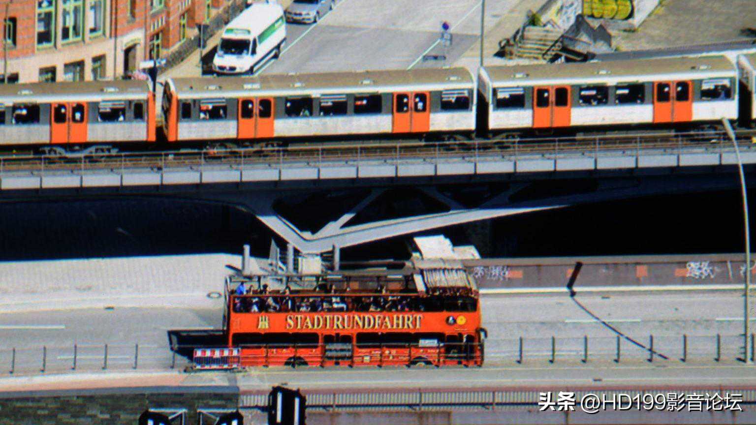 如果打开数字聚焦优化器,它的锐化效果立即上升了一个档次。红色/白色桥梁有更精细的支柱,巴士上的小贴纸清晰可见。然而,字母STADTRUNDFAHRT周围有一个黑色的“框架”。与照片中模糊的遮盖物相似,每一个字母看起来就像是用黑色毛笔重新描绘出来的。