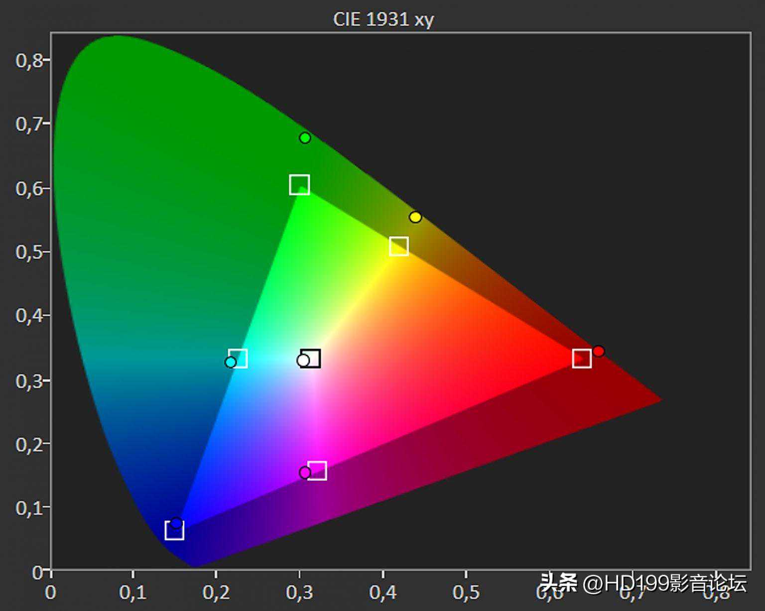 出厂HDTV色彩空间:彩色三角形中的白色方块是目标坐标。圆形彩色圆圈表示测量结果。如果在“胶片1”图像模式中没有进行任何更改,色彩空间将充分利用它的原生范围,并且明显超过了。