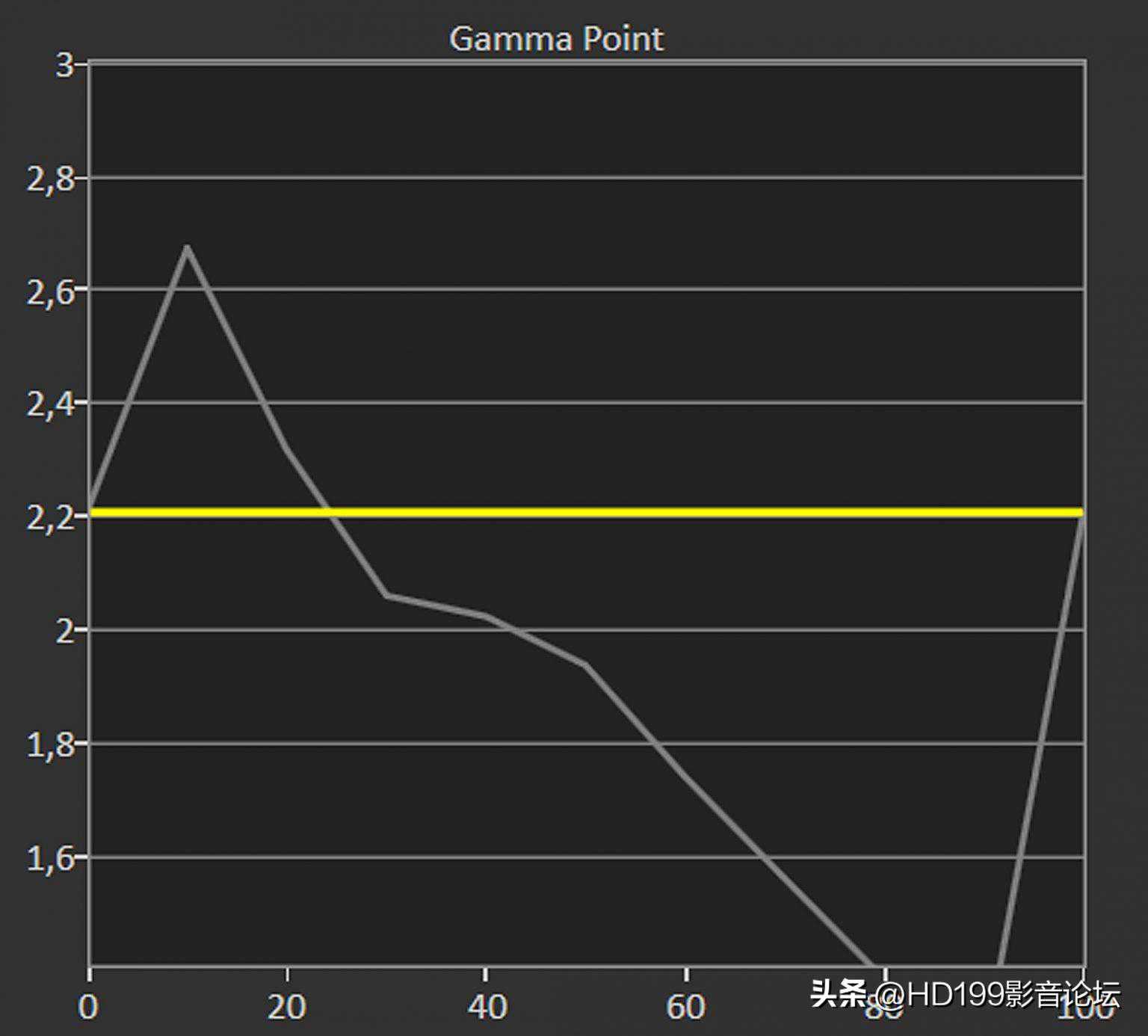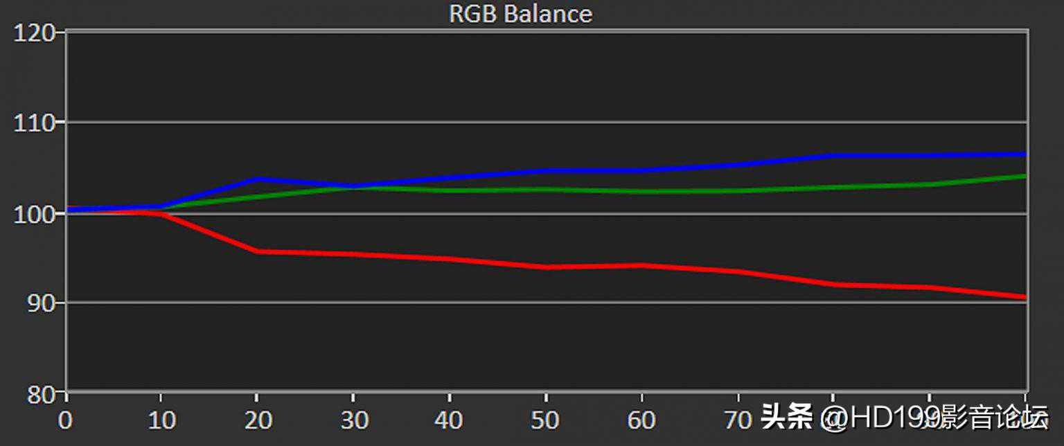 出厂灰阶:RGB平衡出厂在7,000开尔文左右。当蓝色和绿色略高于100%时,红色已经明显下降了。