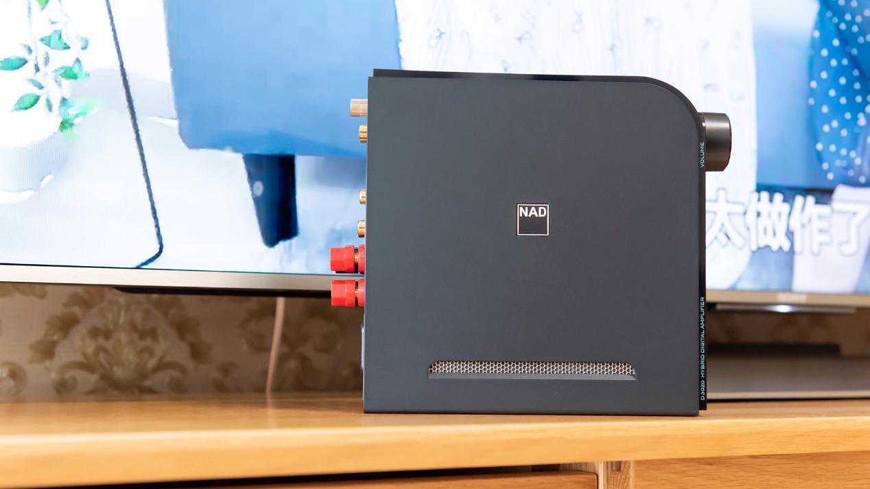 正如上面所说,D3020v2即拥有独立的功放功能,也可以充当解码功放一体机的作用,机身那是一个相当的小巧,大概比一本16开的书要小一些,厚度大约三指。说实话,D3020v2给人的感觉实在是太小了,小巧的机身让人很难将其与功放设备联系到一起。圆弧的造型外加高光漆面的外观简约时尚,摆在居家的环境中可以很好地融入各种简约设计的居家氛围。上面的材质与下面的材质分层交错,从侧面来看视觉上很有层次感,产品的侧面是NAD的标志。实际上这类产品的发热量并不会太大,考虑到长期工作的稳定性和高功率输出可能带来的发热问题,NAD还是在侧面的下面使用了透气网用于散热。