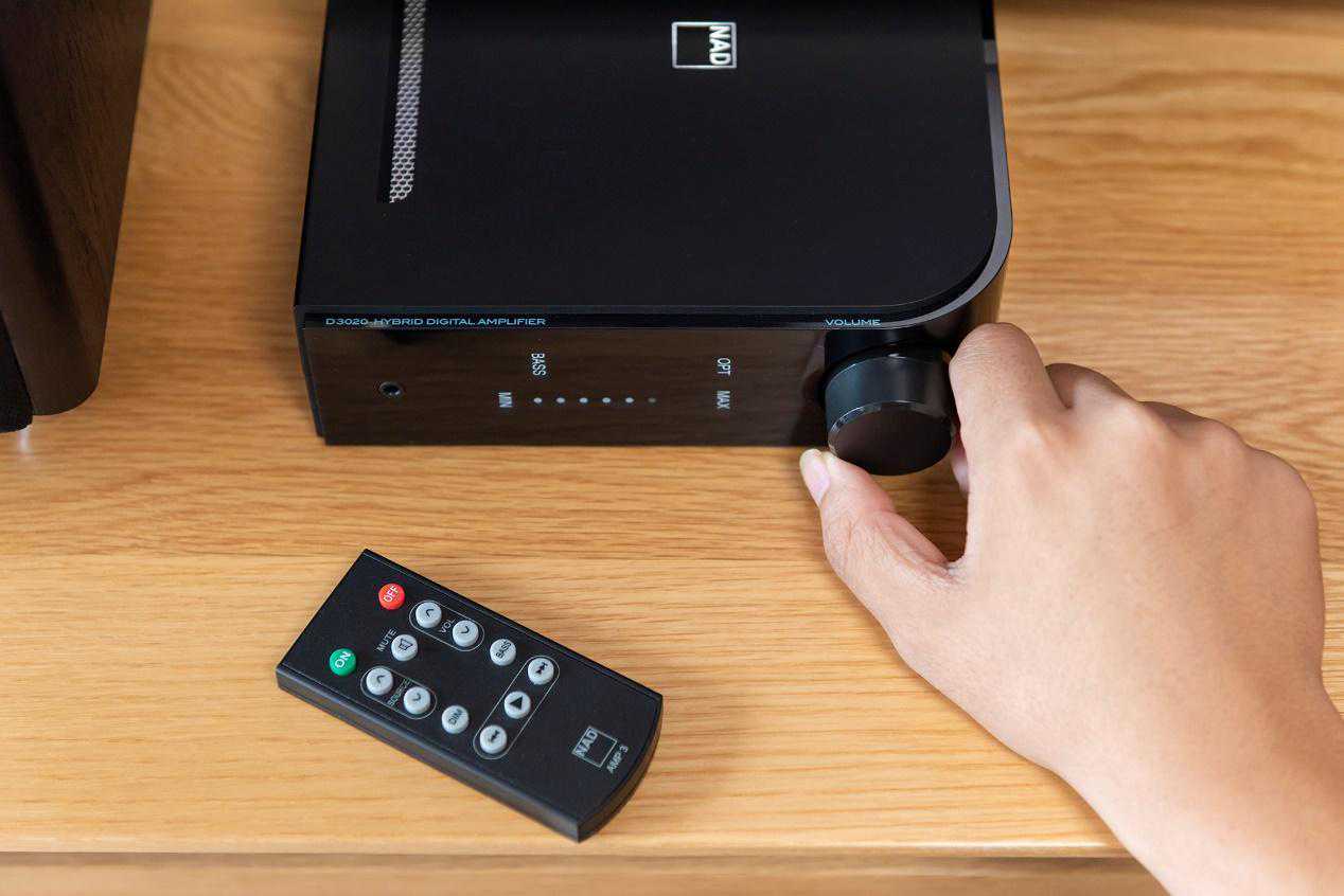 正面有一个调节音量的旋钮,当然用户也可以使用附送的遥控器来操作。相比较而言,我更期待的是NAD可以加入一个app控制从而替代遥控器。正面的信息显示的比较干净,这么一个定位HiFi的家电产品其实并不需要花哨的信息显示,要以实用为主。其实这类产品还有不少用户拿来当做外置“声卡”使用,不少笔记本或者电脑的内置声卡输出口坏了,也是可以使用D3020v2来解决的。