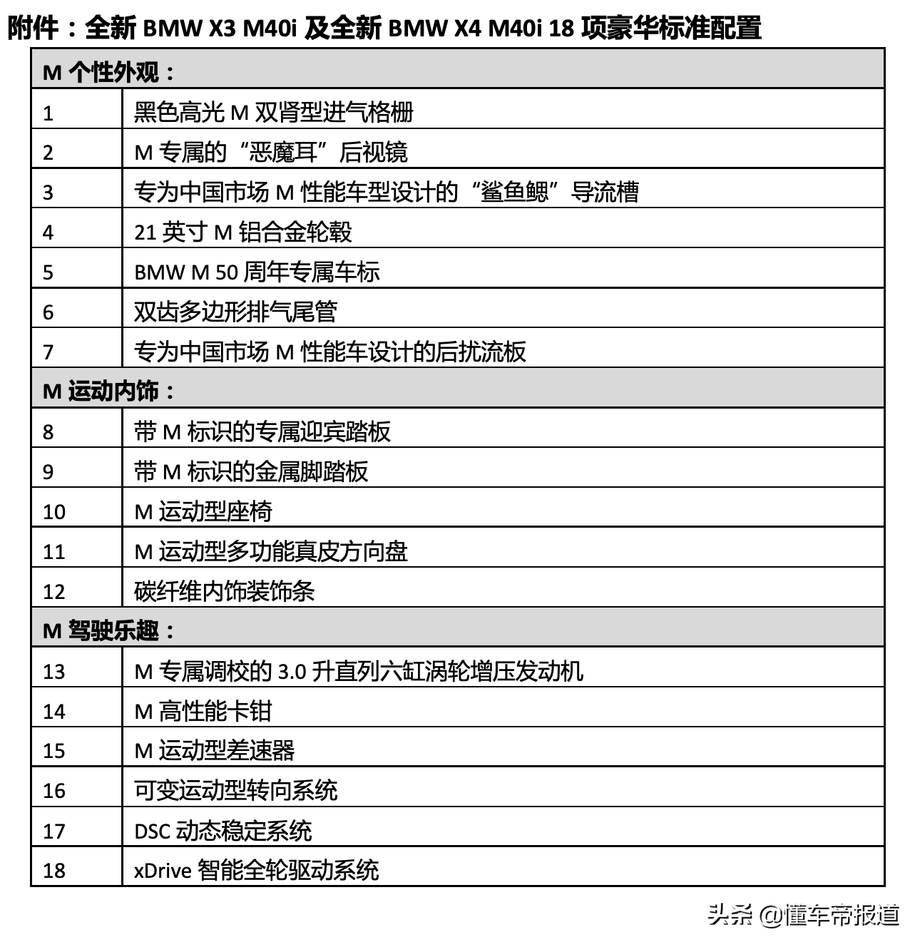 [懂车帝原创产品]5月23日,宝马集团宣布,宝马X3M40i、宝马X4M40i在中国上市,建议零售价分别为62.99万元和65.99万元人民币。两款车型均将搭载M空气动力学组件、BMWM50周年专属车标、最新3.0升直列六缸涡轮增压发动机,车辆的百公里加速时间为5.2秒。