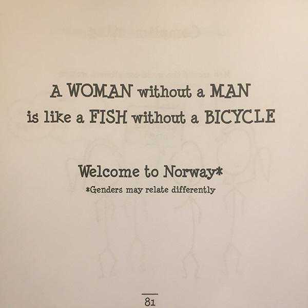 《挪威社会指南》(thesocialguidebooktonorway)中对性别文化的描述:欢迎来到挪威,这里的性别意识可能有所不同,没有男人的女人就像没有自行车的鱼。