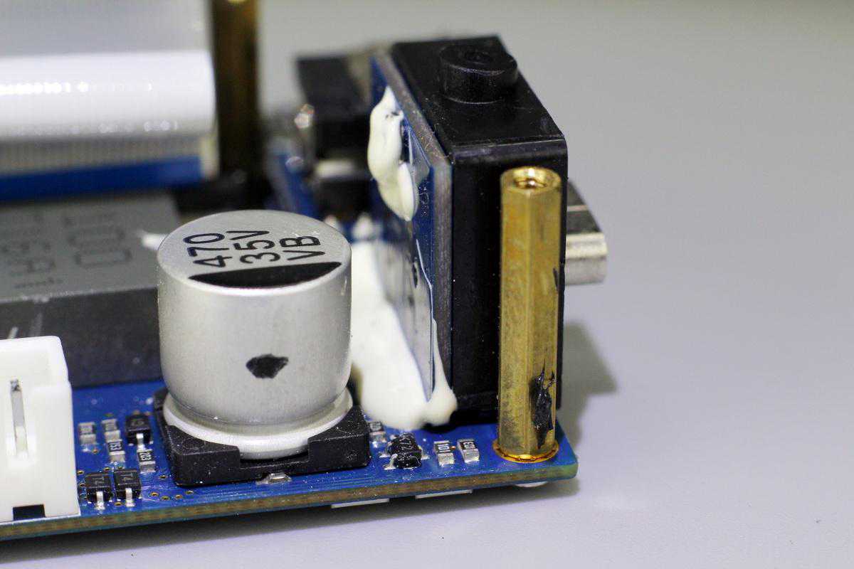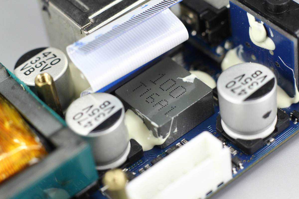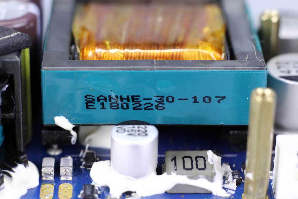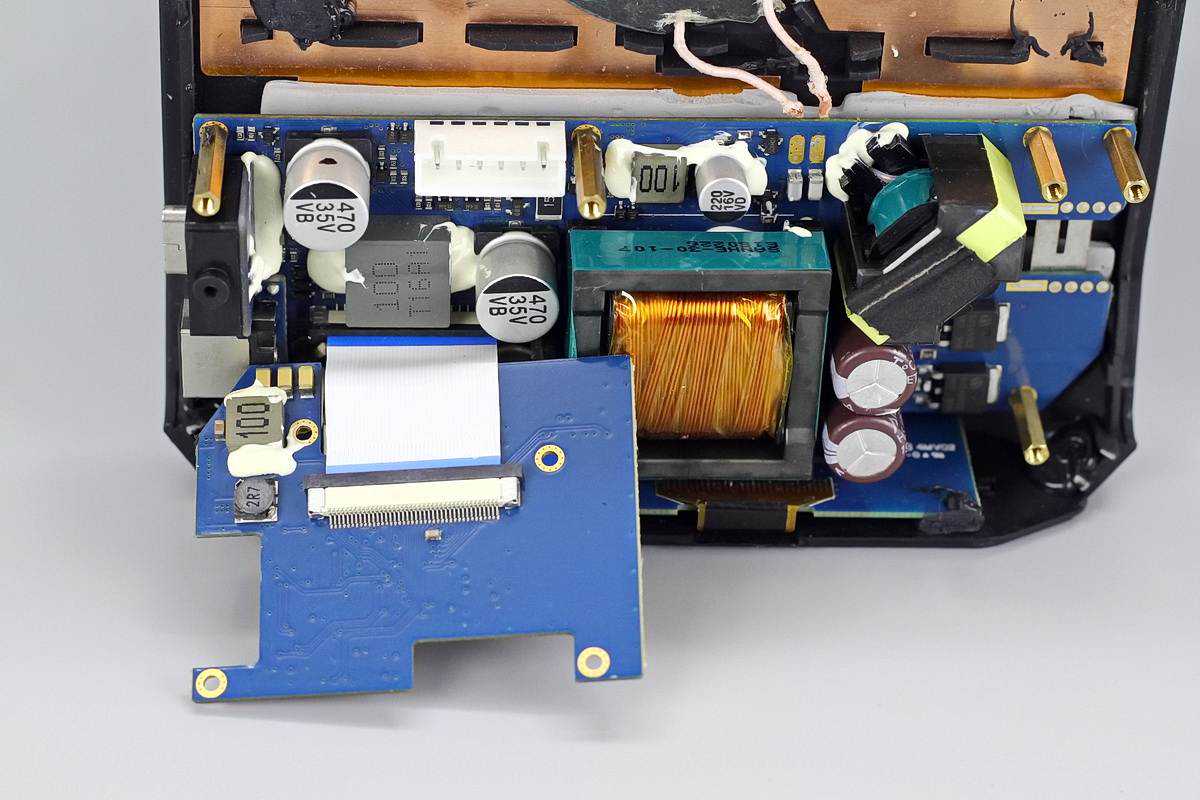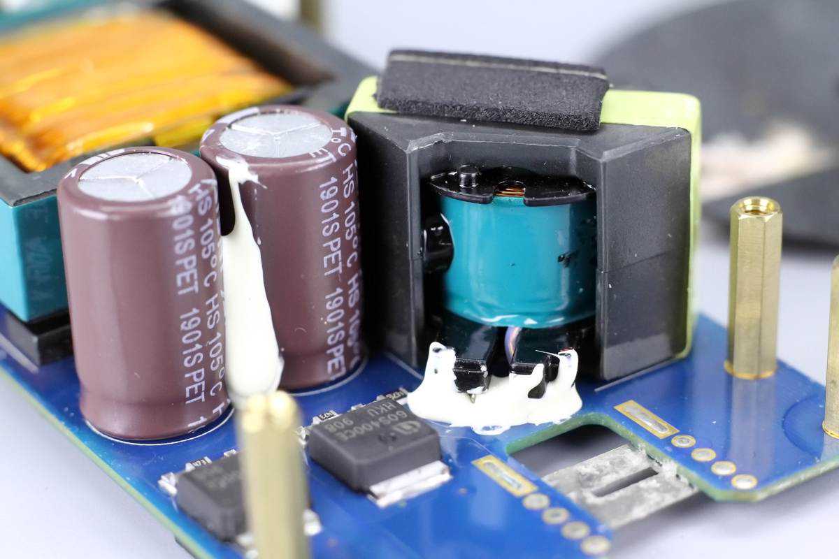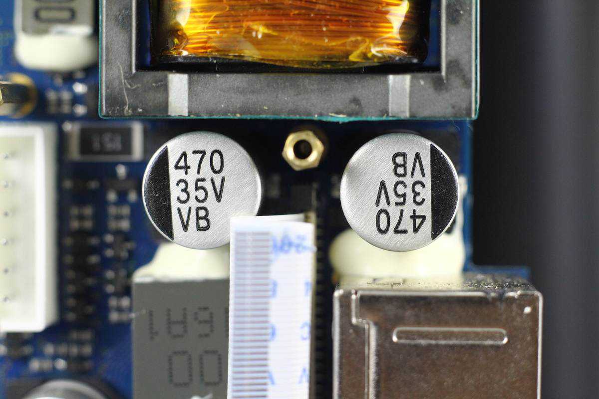 变压器一侧设有两颗输入滤波固态电容,规格都是35V470μF。