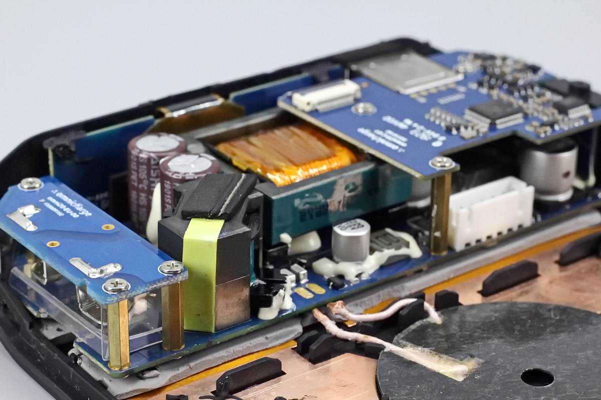 Omni20+充电宝拥有DC、USB-A/C接口以及AC输出插口。其中DC、USB-C口均支持双向快充,最大功率可达100W。AC插口支持100W交流输出,再一对比此前拆解的储能电源的逆变器模块,虽然功率比不上,但能在如此小的多合一充电宝里塞入逆变输出电路,着实让人觉得不可思议。那下面就来看看这款产品的内部是如何设计的。