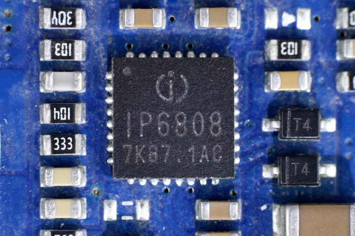 无线充主控芯片采用英集芯IP6808。这是一款无线充电发射端控制SoC芯片,兼容最新标准,支持A11线圈,支持5W、苹果7.5W、三星10W无线充电。IP6808内集成全桥驱动电路和电压电流两路ASK通讯解调模块,集成度很高,有效帮助降低方案尺寸和BOM成本。