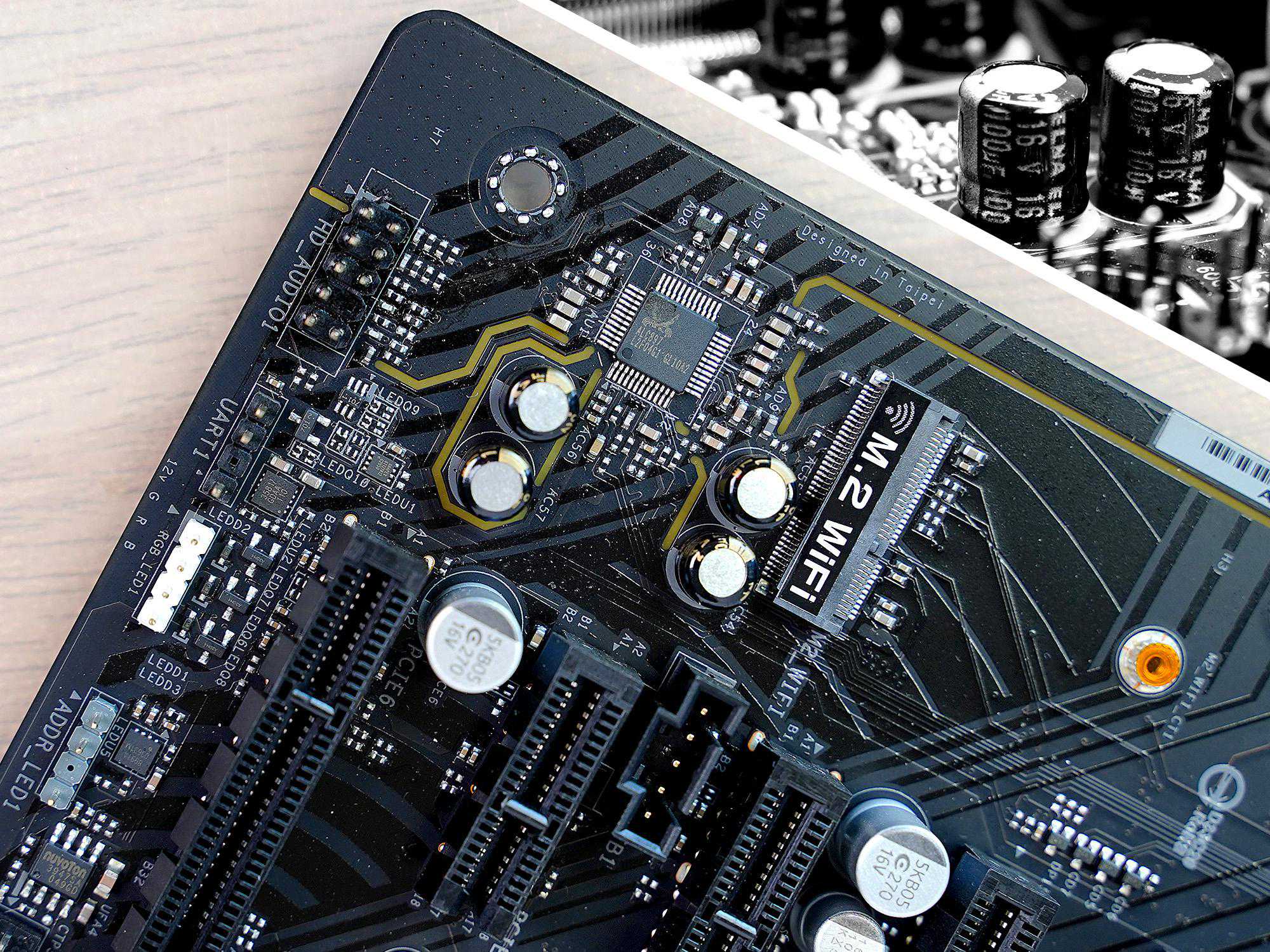 集成声卡是小螃蟹的ALC897,较为普通,搭配了4颗ELNA音频电容;上方有一个KeyE接口,支持2230型WiFi/BT模块,可以自行加装无线网卡;旁边有一个Thunderbolt接针,使用华擎Thunderbolt4AIC卡就可以享受40G的雷电4传输速度,当然并不会标配扩展卡;在主板底部也有1个4pin12V和1个3pin5VRGB插针。