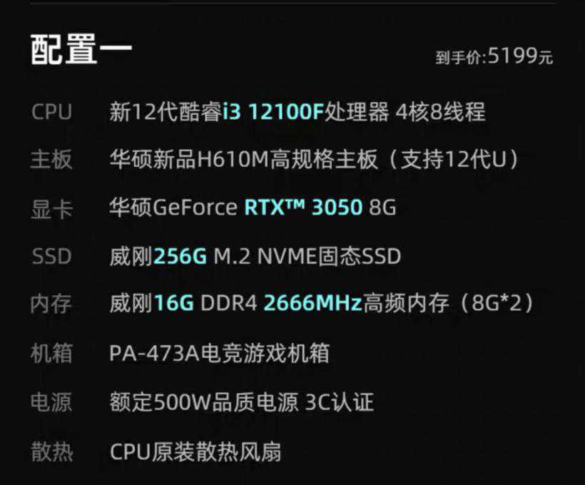 再看主板,华硕自家的H610,华硕官方的价格为759。SSD同样来自威刚256GBNvme,零售价为239。机箱型号是PA-473电竞游戏机箱,查不到价格,就算100。电源写着额定500W品质电源,没写品牌,按150市面价算。散热直接用的intel原装散热,倒是能省则省。