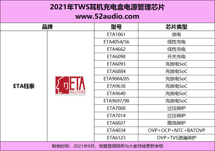 从我爱音频网的此次汇总中可以发现,目前布局TWS耳机充电盒电源管理芯片的厂商仅汇总中就已有23大品牌,其中ETA钰泰、INJOINIC英集芯、LPS微源、德州仪器、SinhMicro昇生微、TPS思远等电源芯片厂商占据着大量的TWS耳机市场份额。