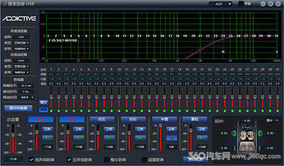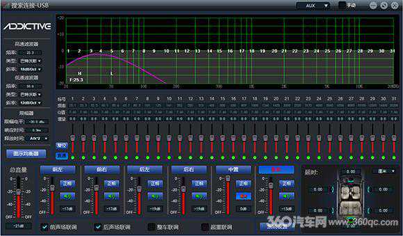 从外观可以看出,DA6S并不是那种内置DSP的大功率专用功放,比一本杂志还略小的体积使DA6S安装方便。厚重的黑色拉丝铝外壳拿到手很有份量感,正中间是ADDICTIVE(音悦传真)的标志,工作时会亮暗红色。输入有两种:4声道的高电平输入还有1组RCA辅助输入,现有市场9成车型可以直接对插而应用。音悦传真发现,现在实际应用DSP功放的车主,绝大部分都是直接用原车主机来听歌,这也说明高电平输入通路要处理得好,因为这才是主流。DA6S针对高电平信号输入的通路,对噪声抑制、前级信号的处理下足功夫,使它和原车主机有更好的音质表现。如在软件里设置噪声“阀”,可使背景更安静效果更佳;电路处理中,也用更加音质型的耦合电容和侦测电路,使高电平输入也有较大的动态、更好的音色。音悦传真认为,将高电平输入做好,才是专用DSP的真正实力所在。