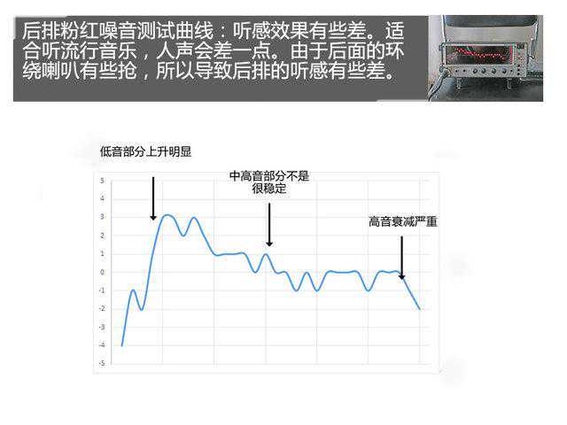 高音的位置让声音出不来,并且A柱的盲区很大。但好在中置可以把声音拉到中间来,要不然聆听效果会很逊色。音质还是JBL的风格,超高音部分衰减的比较厉害,没有很澎湃的那种感觉。由于中控台整个位置设计的很高,所以声场也会很高,中置把声音的定位处理的很好。