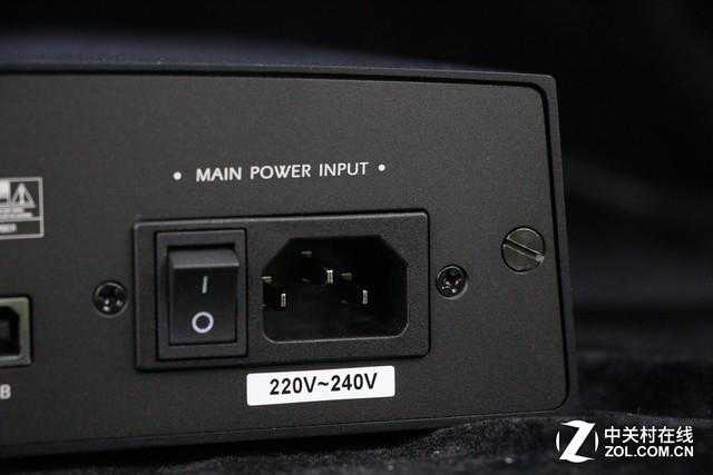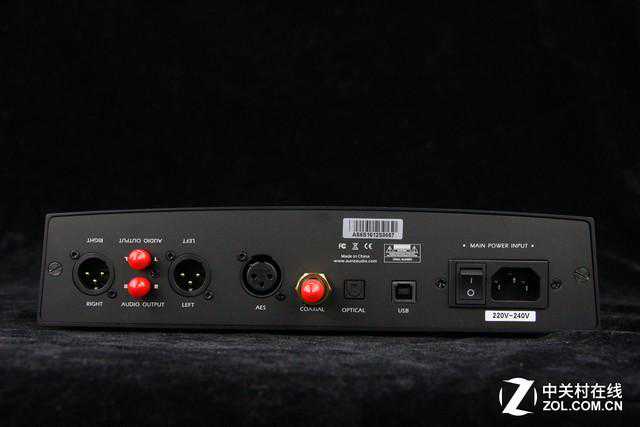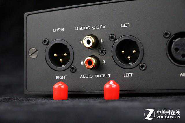 S6的后面板集中了各种输入输出接口。从左到右依次为一对XLR平衡输出,一对RCA输出,一个AES输入,一个同轴输入、一个光纤输入、一个USB输入,最右边是开关和电源接口。在输出接口上,S6很贴心地在接口上方倒印着文字指示,方便用户从机身上方看下去快速准确找到相应的接口位置。S6还给RCA接口和同轴接口都戴了红色的保护帽,黑色的机身配红色的帽子还挺亮骚,只是用户在机器前边看不见。