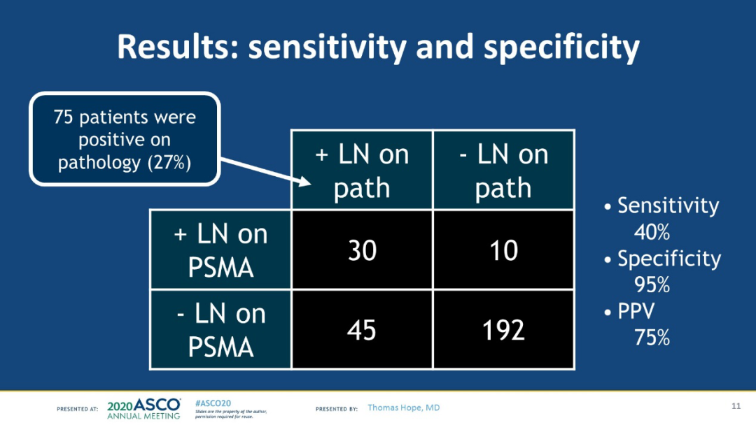 结果显示:在接受前列腺癌根治术(RP)和盆腔淋巴结清扫(PLND)的中至高危前列腺癌患者中,68Ga-PSMA-11PET检测到盆腔淋巴结转移的敏感性为0.40,特异性为0.95;阳性预测值和阴性预测值分别为0.75、0.81。PSA指标越高,检测方法的敏感性越高,当淋巴结病变大于4mm,敏感性、特异性皆较高。