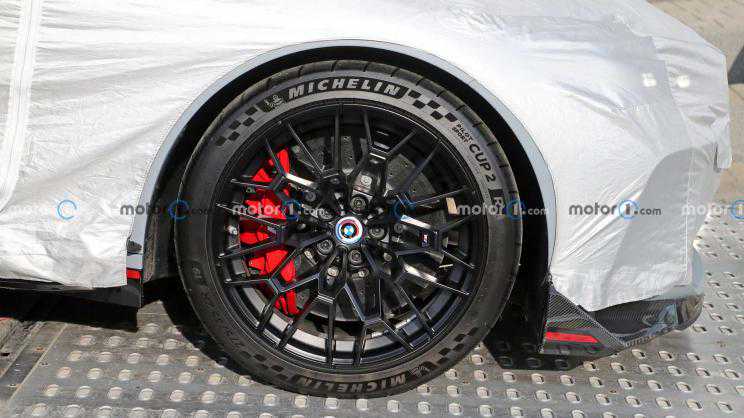 此次除了内饰曝光之外,新车的轮胎型号也被拍摄的一清二楚,m4CSL将配备米其林PilotSportCup2R轮胎,尺寸为275/35R19,这款针对赛道开发的半热熔轮胎预计将使得m4CSL拥有出色的圈速成绩,而这或许也预示着宝马将用这款车型冲击纽博格林北环赛道极限记录。除了轮胎型号,我们通过这张照片还能看到全新的纯碳纤维前保险杠和m部门50周年的专属LOGO。