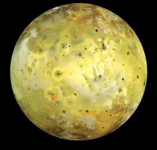 伽利略号于1999年七月所拍摄到木卫一的真实色彩影像,可见表面满布活跃的火山