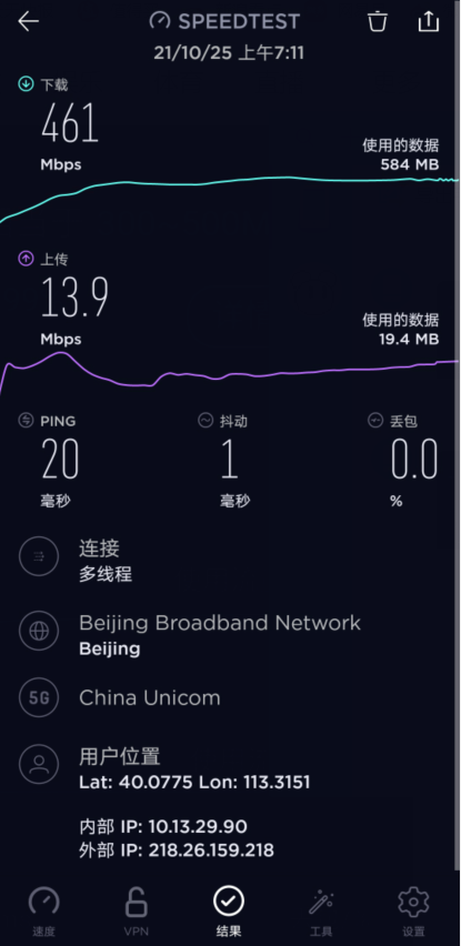 乐视手机S1在CPU方面也选择的是纯国产的紫光展锐的虎贲T7510处理器,这颗处理器支持SA/NSA双模组网,可以覆盖国内主流的5G频段,支持5G全网通。5G模式下,理论下载速度峰值最高可达3.55Gbps。虽然我们在日常使用时,还用不到这么快的速度,但是强悍的5G速度,也对未来的更多应用场景带来了更多可能性。笔者使用的是联通5G手机卡,在室内测速,实测网速能够实现461Mbps的下行速度、13.9Mbps的上传速度,速度表现不错。