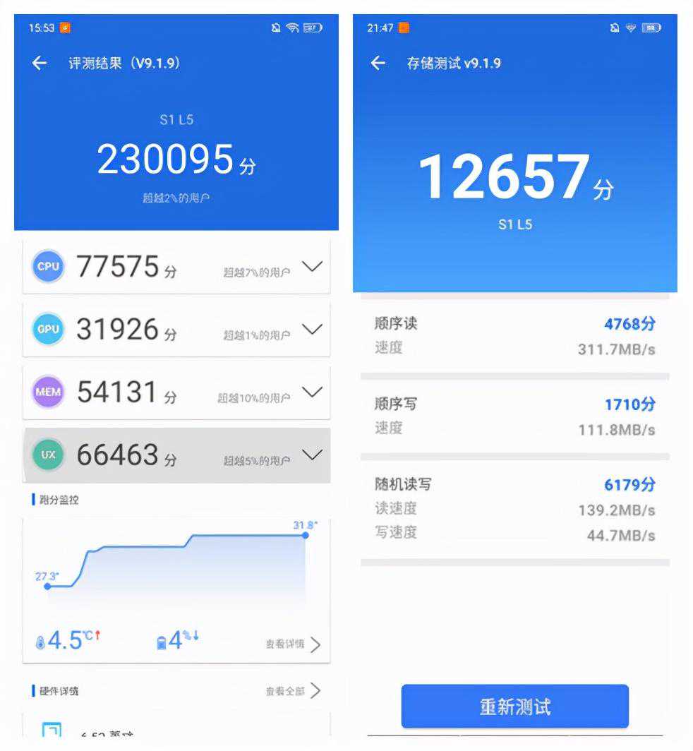 而在安兔兔跑分平台上,跑分成绩为230095分,内存测试结果显示,顺序读取为311.7MB/s、顺序写入111.8MB/s。整个跑分数据表现符合中端机的表现,数据不惊艳,但是完全够用,日常使用也足够流畅。