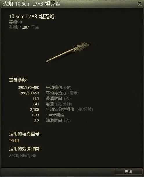 T-54D虽然是D系坦克,还是S系的T-54系列改造而来,可它用的却是一门源自Y系的105毫米L7A3坦克炮。游戏里的大量西方坦克也采用了这门炮作为主炮,只不过T-54D的高爆弹不是拥有较高穿深的HESH(碎甲弹)。T-54D的主炮穿甲弹单发平均伤害390点,标准弹药为平均穿深268毫米的APCR弹,飞行速度1478米/秒。特种弹药为平均穿深300毫米的HEAT弹,飞行速度1173米/秒。T-54D需要装填手进行单发人工装填,基础DPM为2198,折合10.64秒装填一发炮弹。
