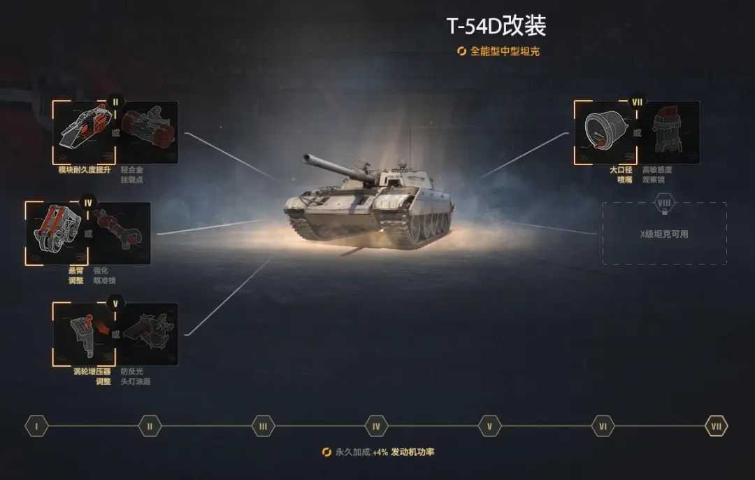 战地升级满级后,坦克可以获得额外的4%发动机功率加成,同时可以选择多项性能改装与1项配件加成栏位选择。性能改装玩家可以选择模块耐久度提升、悬臂调整和涡轮增压器调整。经过上述改装后,T-54D的基础性能会有一定提升。配件方面,可以选择改进耐久/改进型通风系统/结构调整/高级光学观察镜/垂直稳定器等配件以提升T-54D的作战效率,也可以考虑安装涡轮增压器提升它的机动性表现。