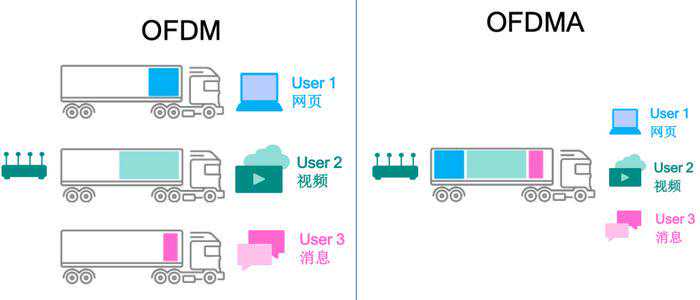 WiFi6的还具备【OFDMA】的技术特性,OFDM在进行传输时无论流量大小,都会独占整个信道,而OFDMA则可以在相同信道同时传输多个用户的数据,还能根据流量类型协调资源,提升信道的资源利用率。