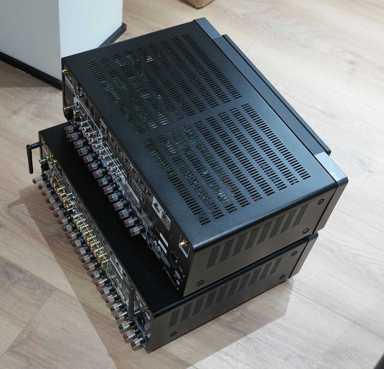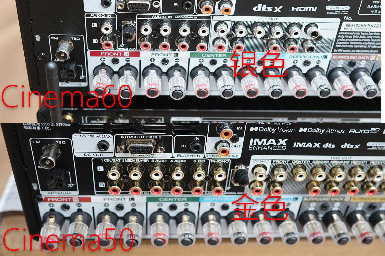 就算侧面看不出来,背后也是一目了然。下面便是9声道放大和11.4声道放大的Cinema50,标价上的6000差价,这里也会体现得比较明显。
