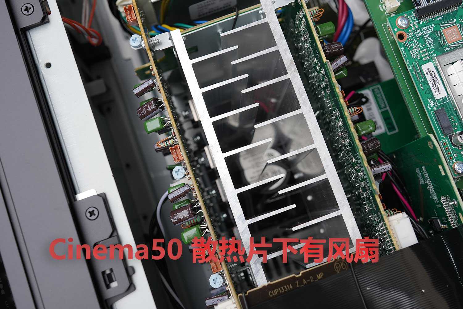 而很明显Cinema50是电脑CPU散热器常见的铝挤压方式制成,同时下面还有一个风扇