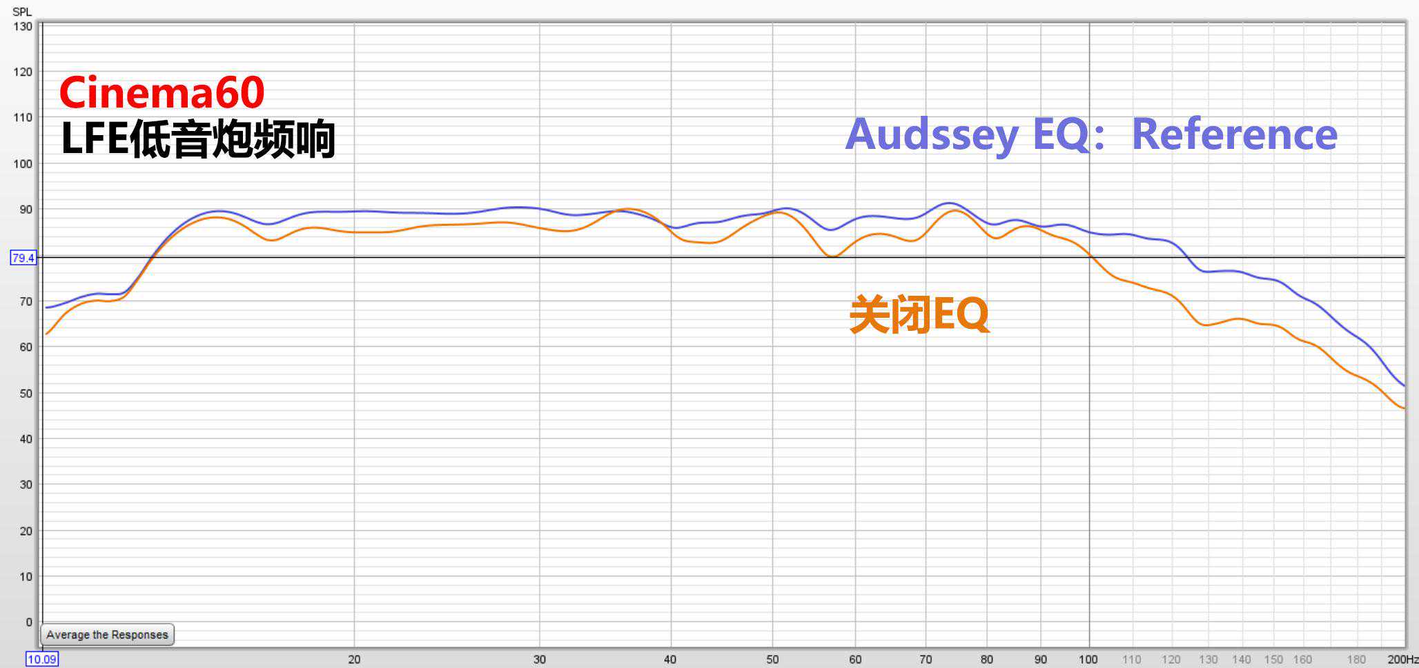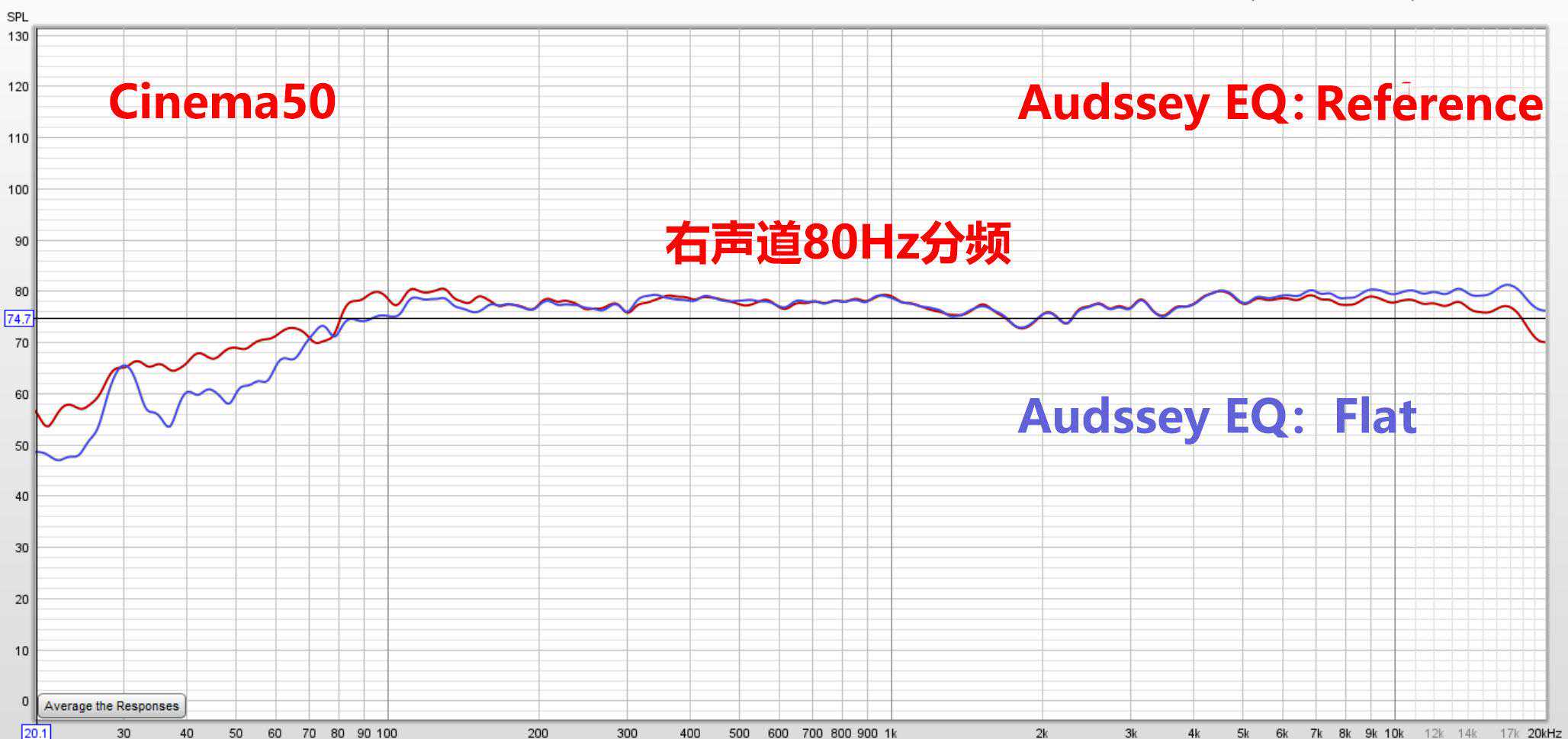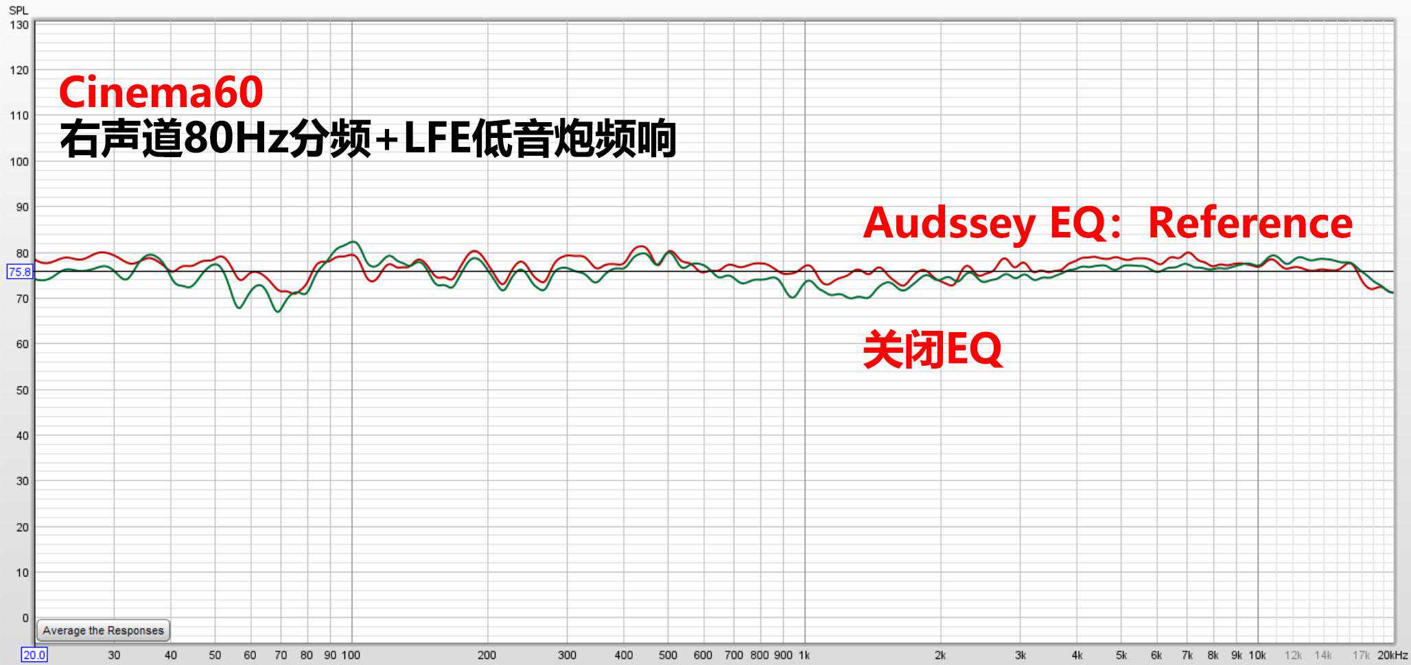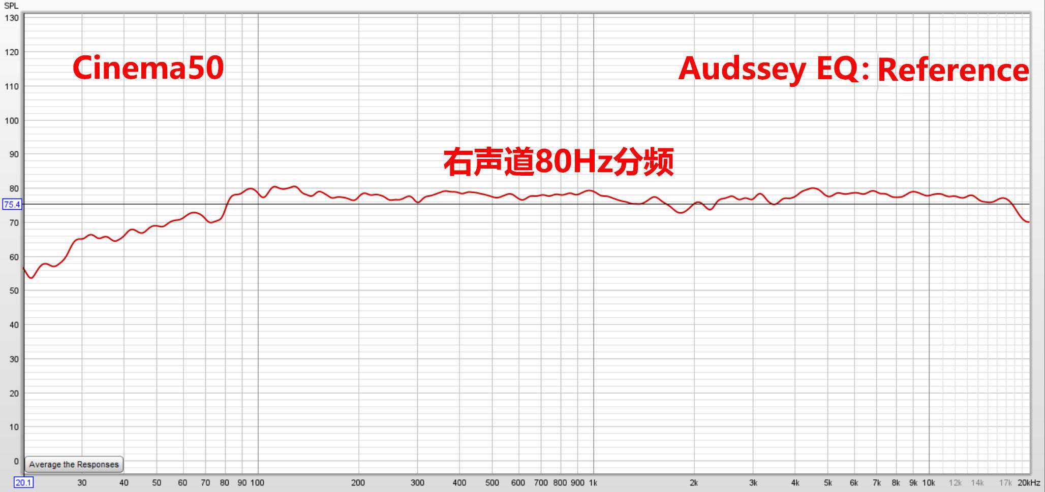 上图主箱还是设到80HZ分频,右声道加低音炮打开AudysseyEQ参考模式的全频表现。