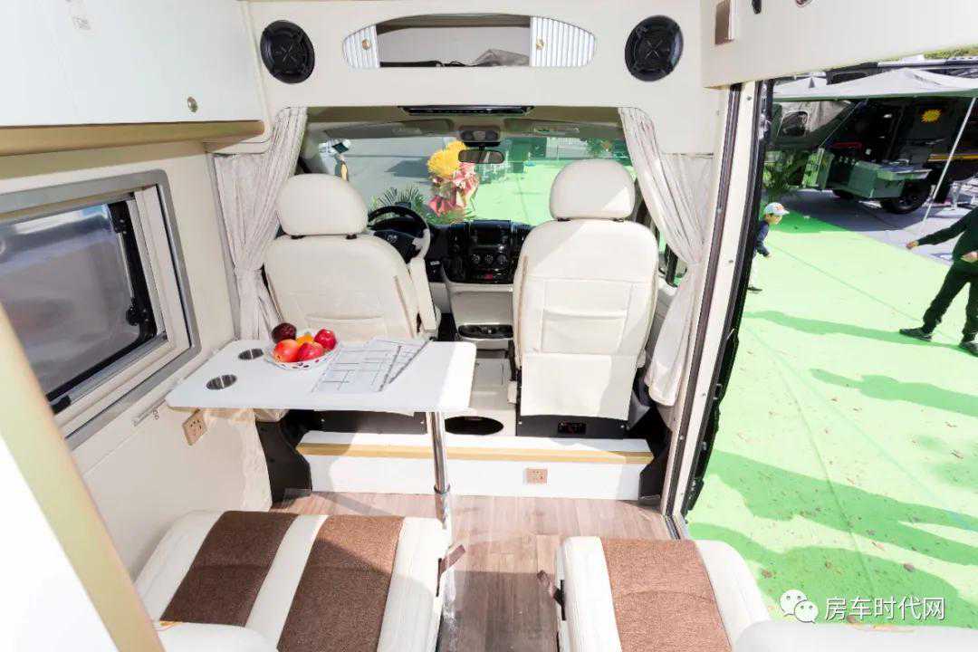 内饰采用白棕双色搭配,美式风格配上温馨居家,氛围营造的相当不错。驾驶室座椅均采用真皮和织布双材质包裹,夏天更透气,冬天也不像纯皮质座椅那么“冻人”,座椅还配备安全气囊,并且均可向后旋转。动力方面搭载3.6LV6Pentasta自然吸气发动和六挡自动变速箱。最大功率210kW,最大扭峰值352N·m,前轮驱动。大排量自然吸气发动机的魅力真的只有试过才知道!相比Ducato的2.3T四缸柴油引擎,少了些低扭,但加速和极速表现更好,在震动控制方面也有着先天优势。驾驶舱上部还配备一台14寸吸顶智能电视、音响系统和储物柜,虽然尺寸不大,但有一定实用性。