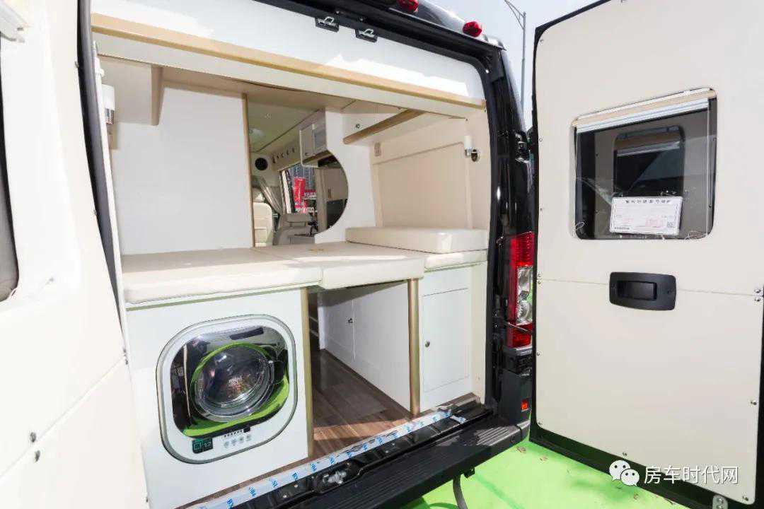 床铺下方左侧是一台洗衣机,右侧是多个储物柜,床铺不使用时可以将床板收起,可以增加车内空间,空出一个可观的过道,停一辆自行车不成问题。