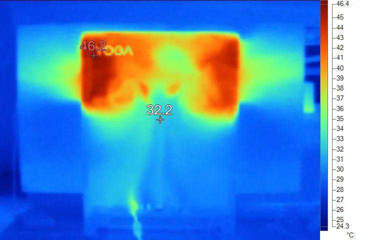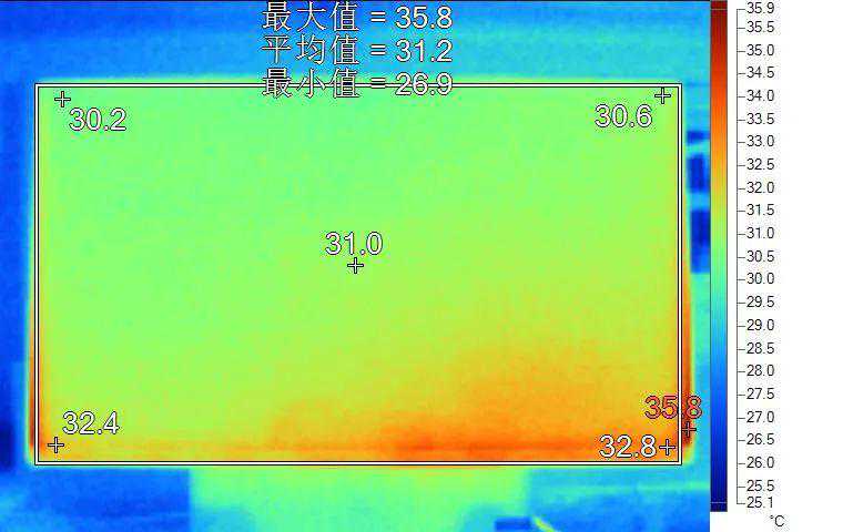 表面温度如上图所示,正面温度最高为35.8℃,平均31.2℃。背面最高温度46.2℃,中心点温度32.2℃。