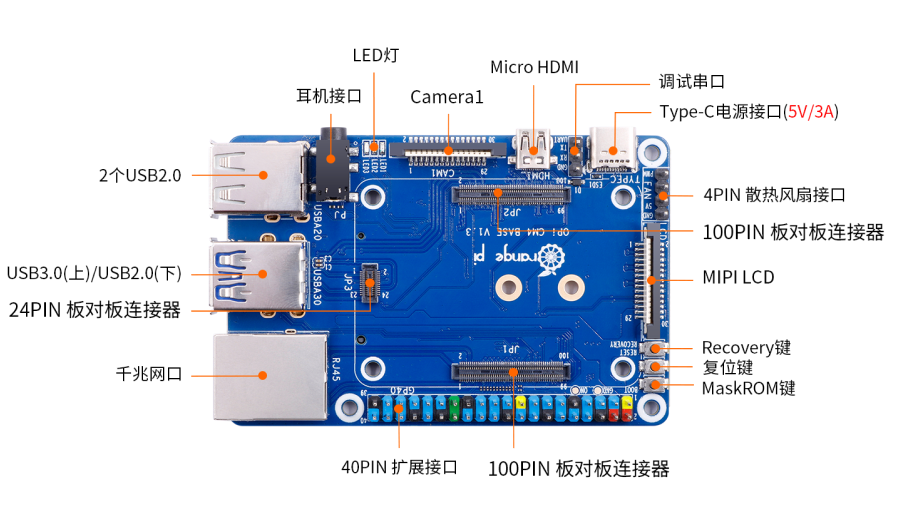 该底板可以搭配OrangePiCM4使用,板载40PinGPIO接口及标准的CM4连接器,汇聚了eDP、MIPIDSI、MIPICSI、、、、、千兆以太网等各类流行的接口,可应用于外部设备控制和扩展。