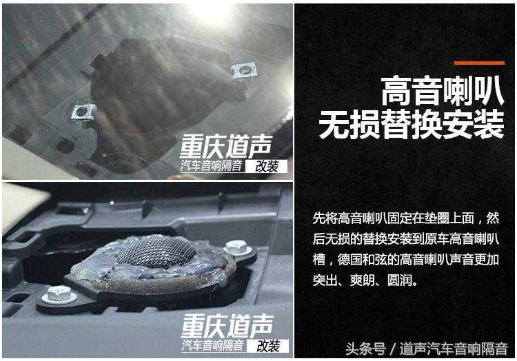 先将高音喇叭固定在垫圈上面,然后无损的替换安装到原车高音喇叭槽,德国和弦的高音喇叭声音更加突出、爽朗、圆润。