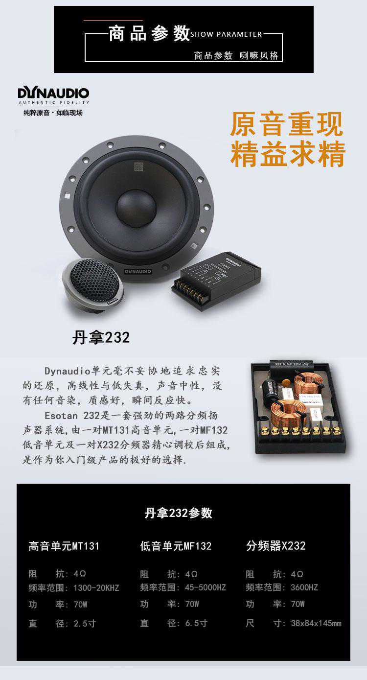产品特点:丹拿232声音表现水准出众,中低频不尖锐,细节丰富,清晰感觉,能简单的方式获取高质量的两分频扬声器,是丹拿产品中的性价比之选