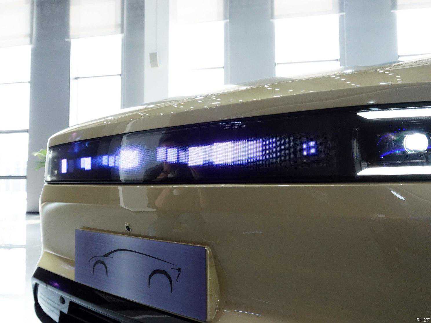 前部灯组日行灯采用近似欧元标识“€”的设计,中间部分则是一块显示屏,能够显现出丰富多彩的互动图案或效果。大灯下方两侧各布置了一套雷达模组,未来有望配备高阶自动驾驶功能。