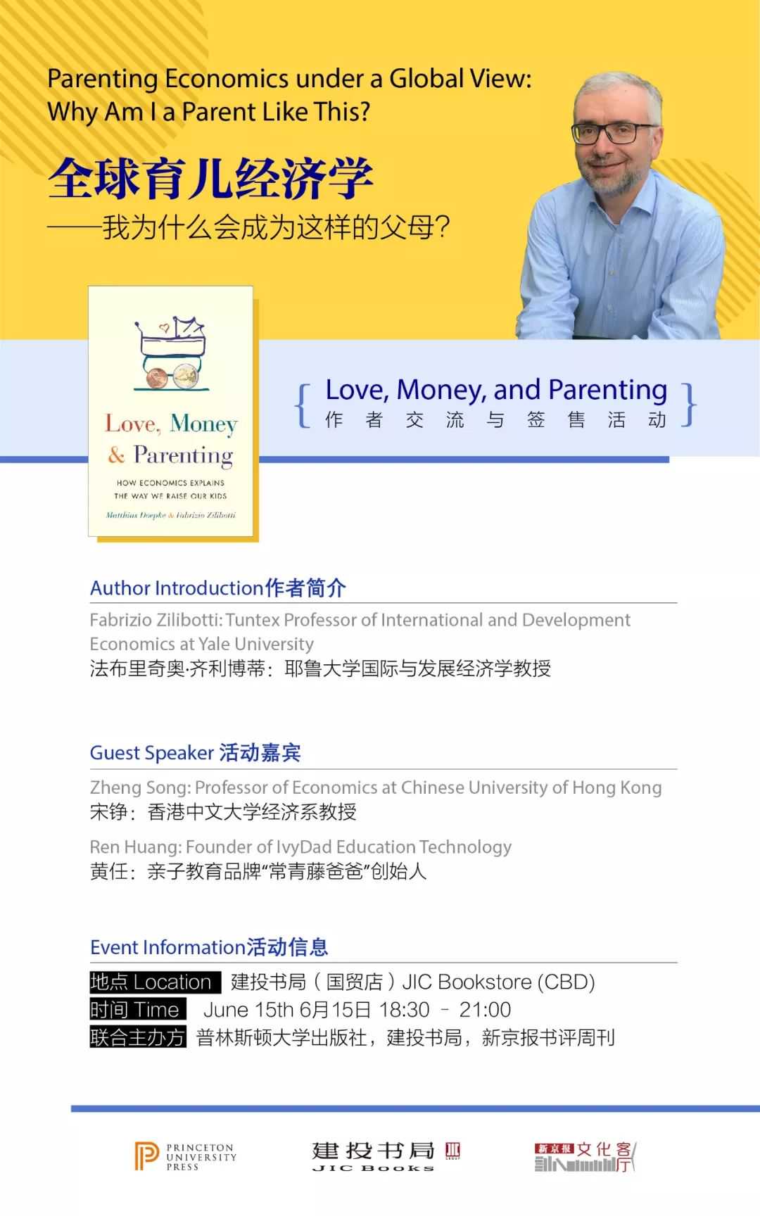 新京报·文化客厅的第四场活动,由新京报·文化客厅联合普林斯顿大学出版社、建投书局共同主办,活动嘉宾是耶鲁大学国际与发展经济学教授法布里奇奥·齐利博蒂,香港中文大学经济系教授宋铮,特约主持亲子教育品牌“常青藤爸爸”创始人黄任。
