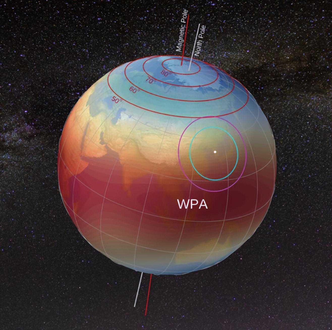 地磁场起源于地球内核,分布在岩石圈、大气层、电离层、磁层以至广袤的行星际空间,是日地系统多圈层耦合的重要基础。在漫长的地质历史时期,频繁的地磁倒转与地磁偏移曾严重破坏地球的宜居环境并对生物演化产生至关重要的影响。然而,地磁倒转与生物灭绝的因果关系从“一对一”假说到“多对一”假说的过渡,更加强调了地磁场长期变化对气候演化的影响。近1个世纪以来,地磁场正在持续减弱,其强度降低了约10%。2023年,中国漠河地区多次出现极光,在新疆、北京与河北多地也罕见地观测到了极光现象,这将把地磁场变化对气候的影响研究推向新的高潮。中国科研团队编译了古汉语圈朝鲜半岛正史中记录的西太平洋区域负地磁异常区(WPA)(图4)红色赤道极光数据库。千年赤道极光的发现与西太平洋地磁异常的提出将为未来研究区域地磁场异常对区域气候的影响提供独一无二的历史视角。