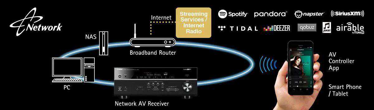 AirPlay,Spotify*,Pandora*,Napster*,Tidal*,Deezer*,Qobuz*,JUKE*musicstreamingservice