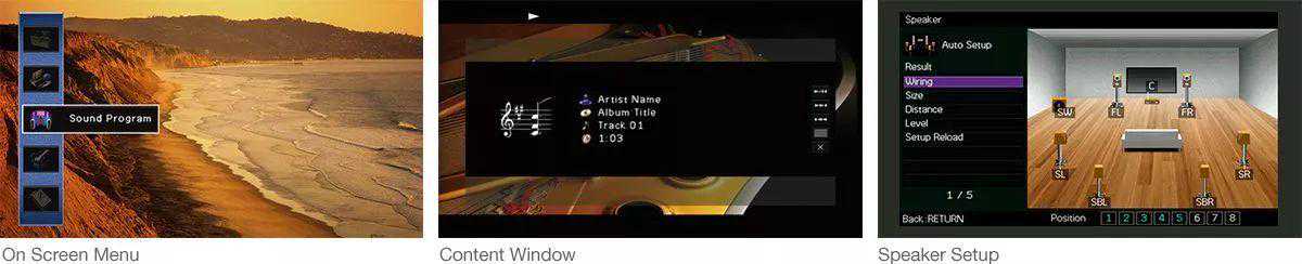 Yamaha的最新图示使用者介面(GUI)有高分辨率显示的操作简易选单,另外还有一个可选状态功能条,显示输入源、音量、DSP模式与音频格式。GUI共有8种语言任您选择:英文、法文、德文、西班牙文、义大利文、俄文、日文和中文,可选择以正常或3D图片显示。