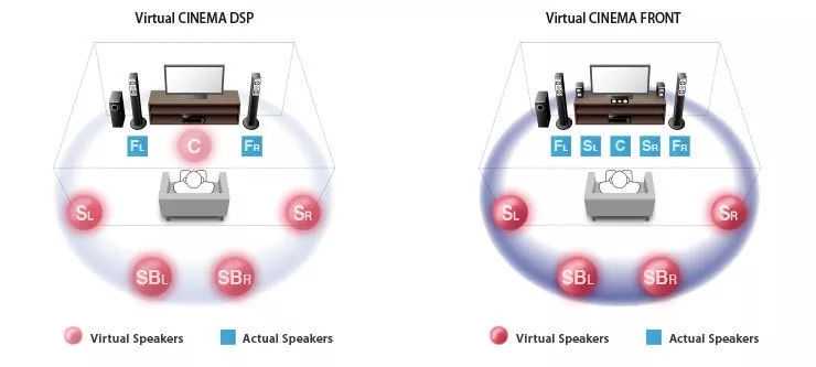 即使您的居家环境难以在视听室后方架设环绕扬声器,VirtualCINEMADSP透过将环绕扬声器摆放在前方,重现虚拟7声道环绕音效。VirtualCINEMAFRONT功能让您透过前方两个环绕喇叭以及一个前方的中置喇叭,便可享受更高音质/高解析的7声道虚拟音以及高定位感的后方环绕。只要新增两个前方临场喇叭,就可以提供3D音场效果,让你感受到声音的高度、深度以及移动感。在空间内安排扬声器配置变得更加弹性,亦可享受高品质的环绕音。增加两个额外的前方临场扬声器,提供3D音场,提供高度与深度的立体移动感音。你可以更有弹性的配置房间内的扬声器,也可以享受到高品质环绕音效。