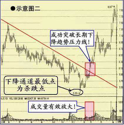 个股经过长时间的大幅下跌,在成交量放大的配合下成功突破长期下降趋势线的束缚,很快出现了大幅上涨的走势,给投资者提供了一次良好的买入机会(请参见下图二)。