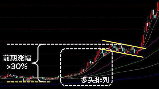 上升旗形通常出现在明显的多头行情中,移动平均线中短期均线居上,往下依次为中期均线、长期均线,均线系统呈现明显的多头排列状态。上升旗形形成之前,股价通常已经有了一段相当大的涨幅。一般情况下前期股价涨幅至少在30%以上,而一些走势较为强劲的牛股在出现上升旗形调整之前,涨幅能达到50%以上。