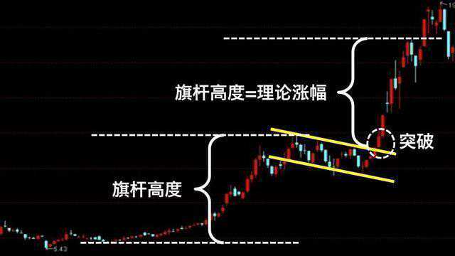 当股价放量突破上升旗形的上边阻力线并且站稳,被视为是上升旗形的有效突破。理论上,上升旗形被股价有效突破之后再次上涨的高度等于旗形形态出现之前的股价上涨高度,也就是说旗杆部分的高度很可能就是上升旗形有效突破之后的理论涨幅。